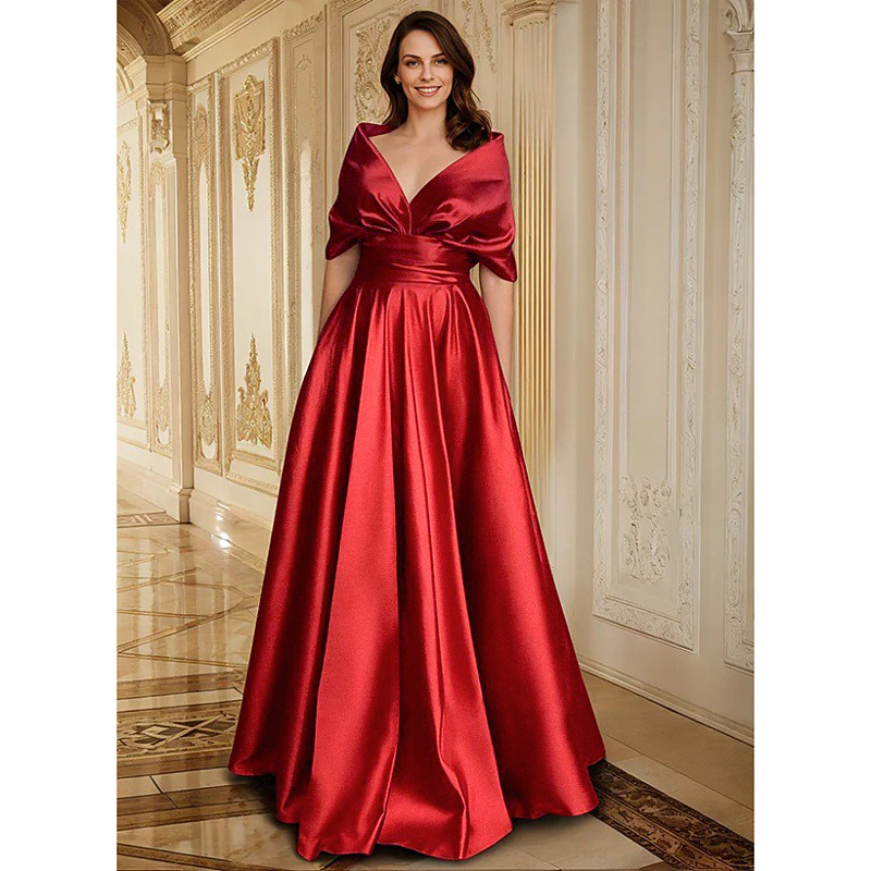 A-Line Floor Length Evening Gown Ball Gown Formal Dress Elegant Half Sleeve V Neck Wedding Formal Satin with Pleats Ruffles