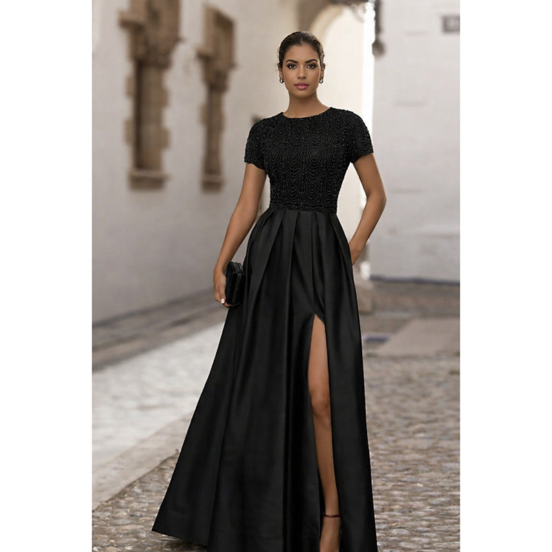 A-Line Floor Length Evening Gown Ball Gown Formal Dress Elegant Vintage Glittering Short Sleeve Jewel Neck Formal Pocket Satin with Rhinestone Glitter Slit