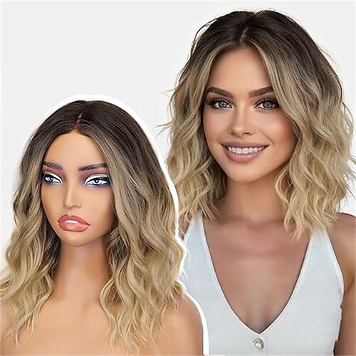 Parrucche da donna con mèches color caramello da 14 pollici - parrucca ondulata lunga fino alle spalle con attaccatura dei capelli in pizzo pretagliata, riga centrale, caschetto ondulato naturale,