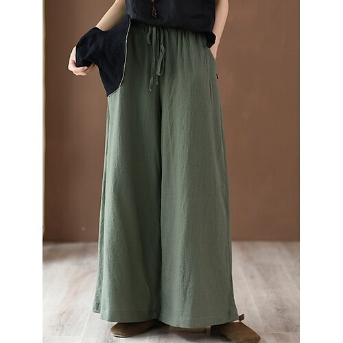 Per donna Gamba larga Pantaloni di Lino Pantaloni Leggero Casual Lunghezza intera Vita media Semplice Tasca Traspirabilità Confortevole Inelastico Casa Casual Quotidiano Azzurro Blu marina Nero Verde