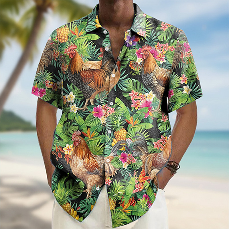 Men's Coconut Tree Rooster Tropical Plants Summer Hawaiian Shirt Button Up Shirt Aloha Shirt Short Sleeve Hawaiian Funny Vacation Beach Wear Summer Spring Turndown 3D Print Collared Shirts Blue Green