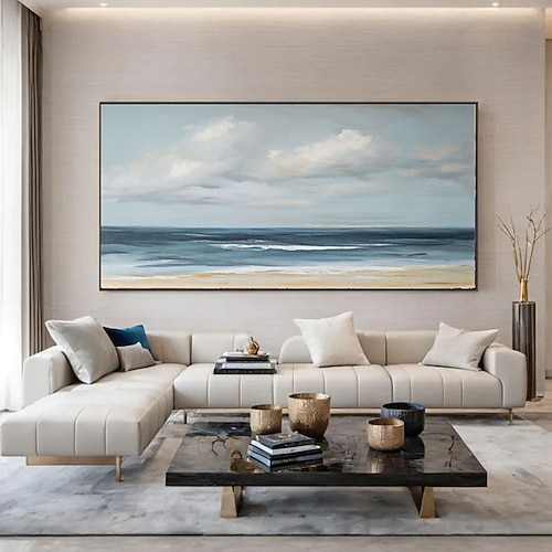 Pittura cielo e oceano dipinto a mano pittura di paesaggio calmante pittura a olio di paesaggio neutro fatta a mano beige chiaro estetico acrilico onda mare pittura pittura di arte minimalista