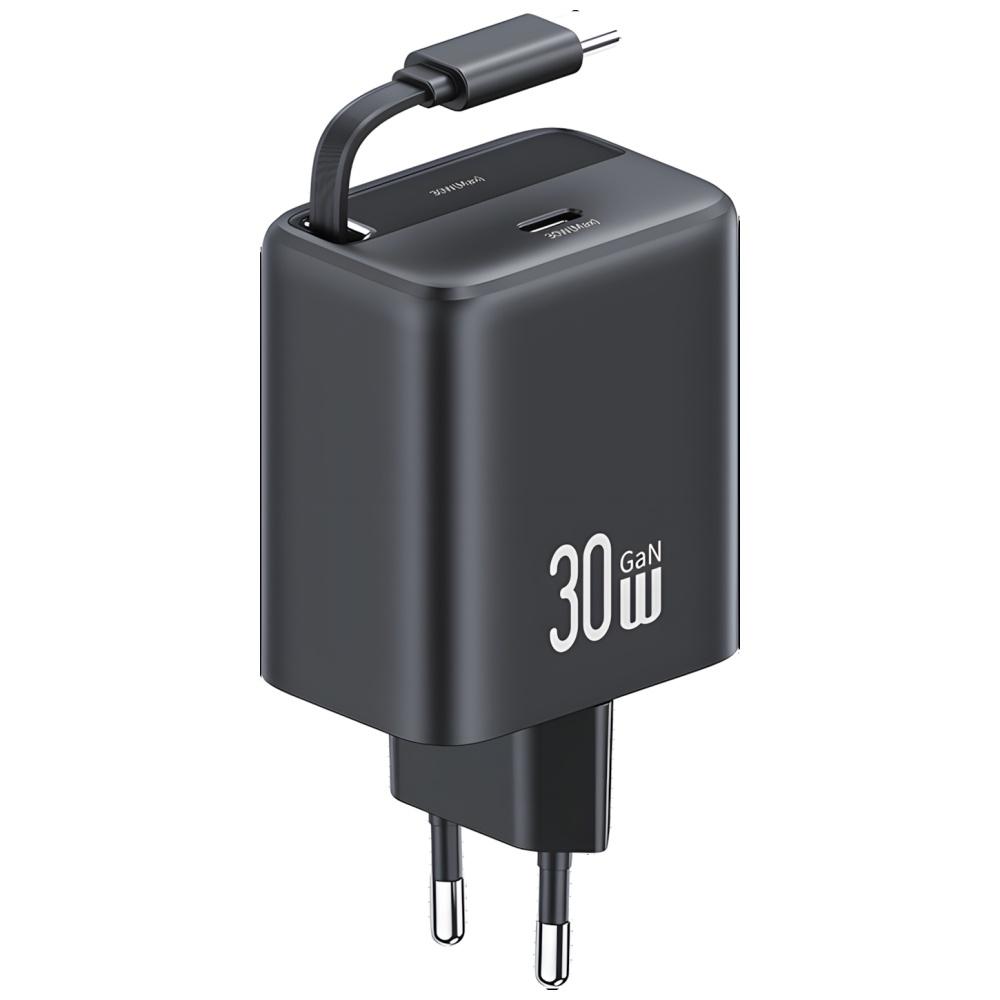 USAMS Väggladdare 1xUSB-C m utdragbar kabel PD+QC 30W GaN - Svart