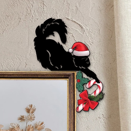 Adesivo per porta a forma di gatto nero natalizio con cappello natalizio, grazioso davanzale creativo in legno leggero da 10 pollici, decorazione natalizia per esterni, camera da letto