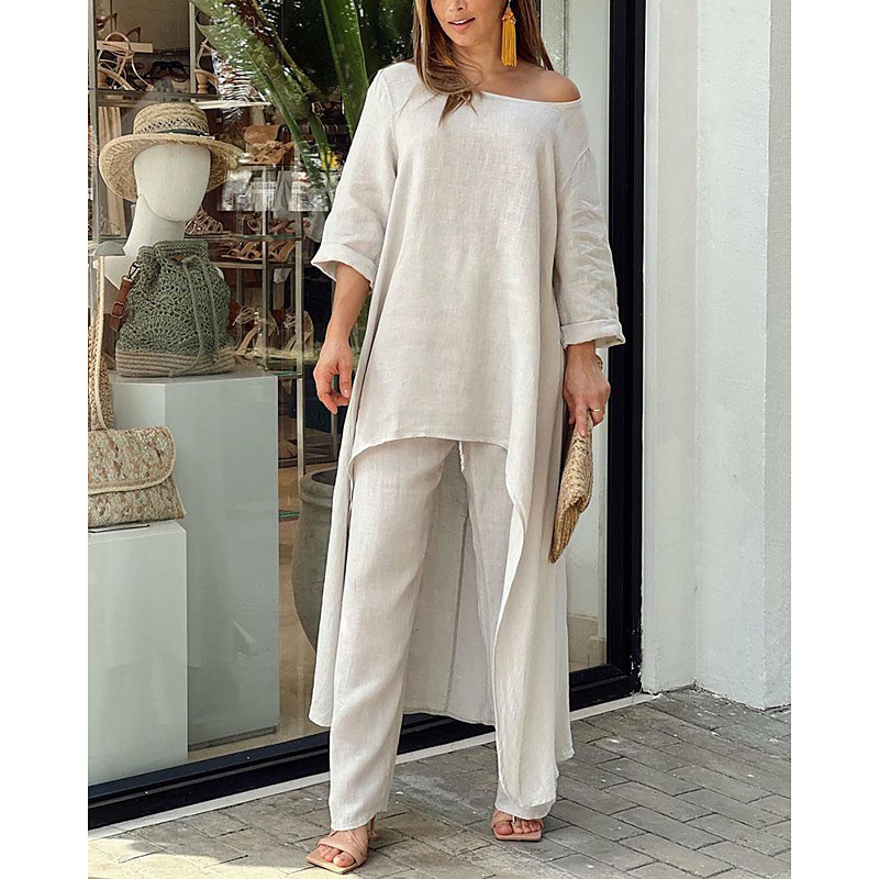 Women's Fashion Streetwear Shirt Cotton Linen Sets Two Piece Sets Long Sleeve Shirt Collar Plain Daily Wear Date White Blue Green Summer Regular Fit