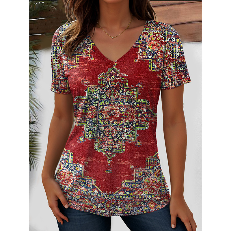 Women's T Shirt Graphic Geometric Paisley Bohemia Vintage Stylish Short Sleeve V Neck Regular Tops Daily Going out Beach Wear Print BlackWhiteRed Black White Red Purple Summer