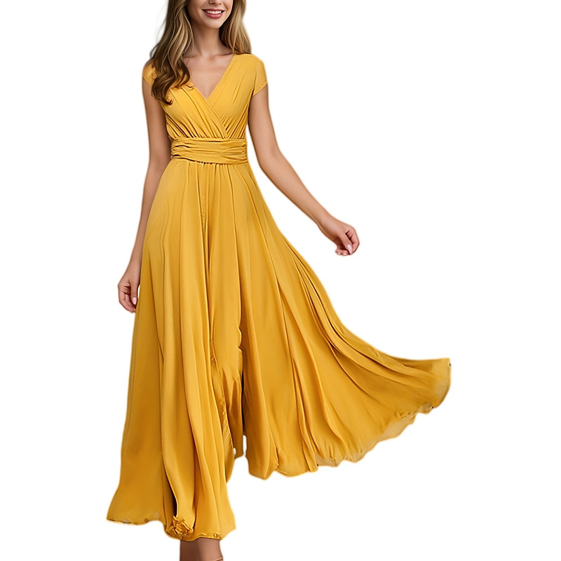 Women's Maxi long Dress Boho Wedding Guest Dress Elegant Stylish Regular Fit Plain Short Sleeve V Neck Black White Yellow Light Green Summer Spring