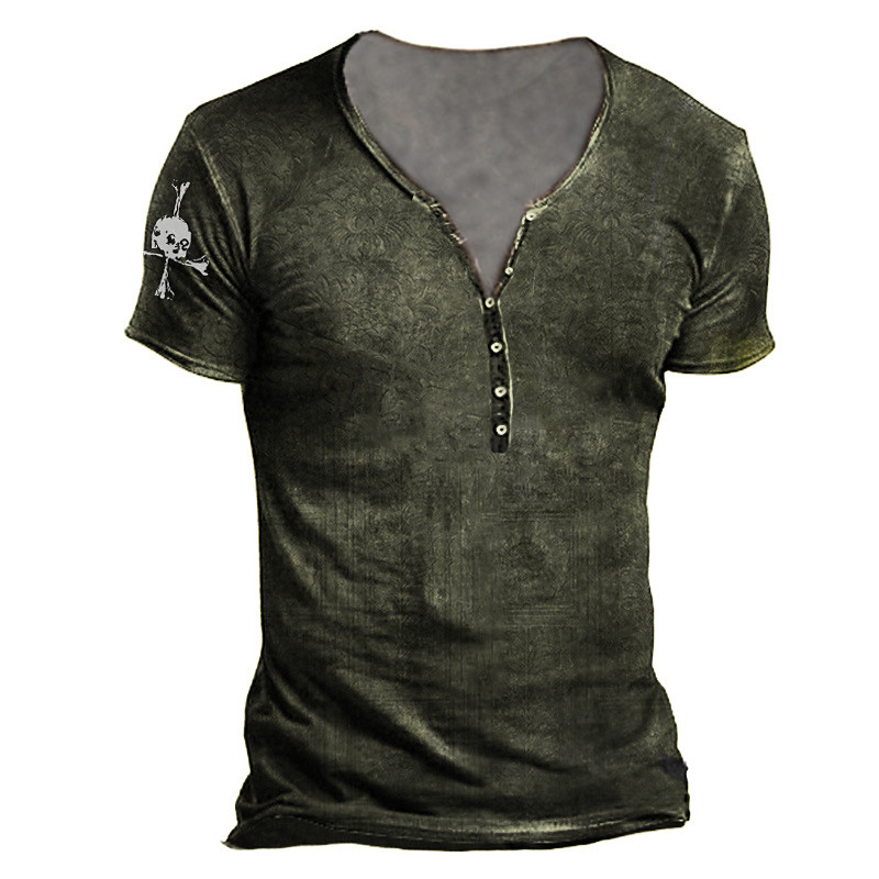 Men's T shirt Tee Henley Shirt Skull Graphic Prints Henley Black Army Green Brown Khaki 3D Print Outdoor Casual Short Sleeve Button-Down Print Clothing Apparel Stylish Lightweight Vintage Breathable