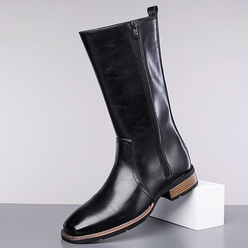 Men's Black Faux Leather Motorcycle Boots with Side Zipper, Classic Knee-High Riding Boots for Biker and Casual Wear