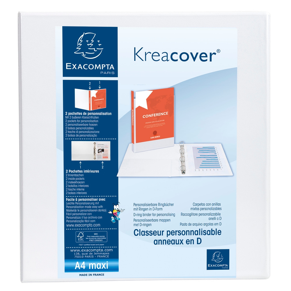 Exacompta Personalisierbares Ringbuch aus PP 2,3mm, 4 Ringe 60mm, Rücken 90mm, 2 äußere Klarsichthüllen, 32x30cm für DIN A4 Überbreite - Kreacover