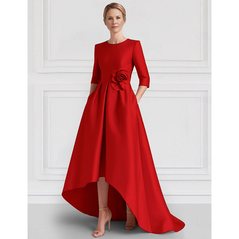 A-Line Asymmetrical Floor Length Evening Gown Ball Gown Formal Dress Elegant Silky Half Sleeve Crew Neck Wedding Formal Champagne Mother Of the Bride Dress Stretch Satin with Pocket