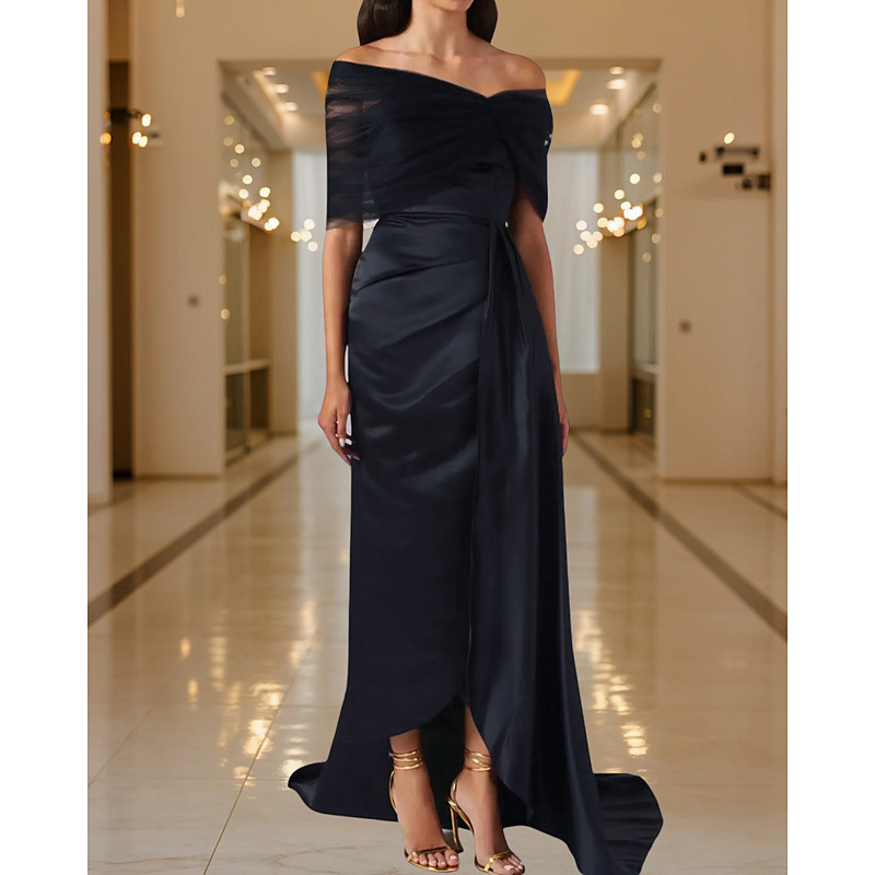 A-Line Mermaid Trumpet Sweep Brush Train Evening Gown Ball Gown with Overskirt Formal Dress Elegant Celebrity Style Sleeveless Off Shoulder Garden Party Wedding Tulle Stretch Satin with Pleats