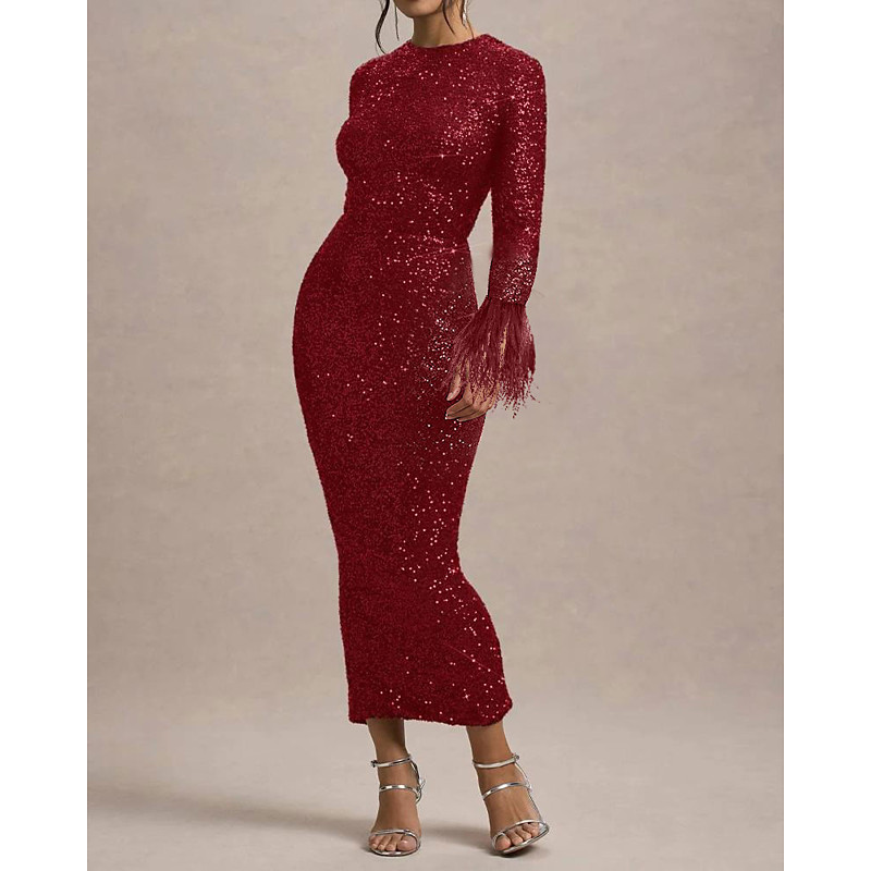Mermaid Trumpet Floor Length Prom Dresses Evening Gown Ball Gown Formal Dress Elegant Glittering Celebrity Style Long Sleeve Crew Neck Garden Party Wedding Sequined with Feather