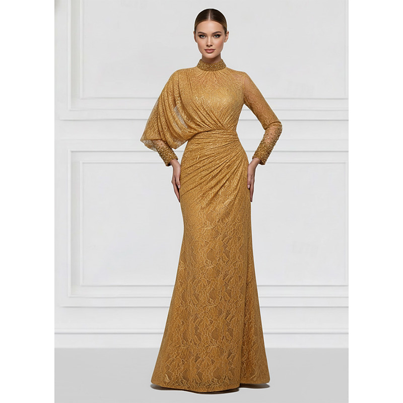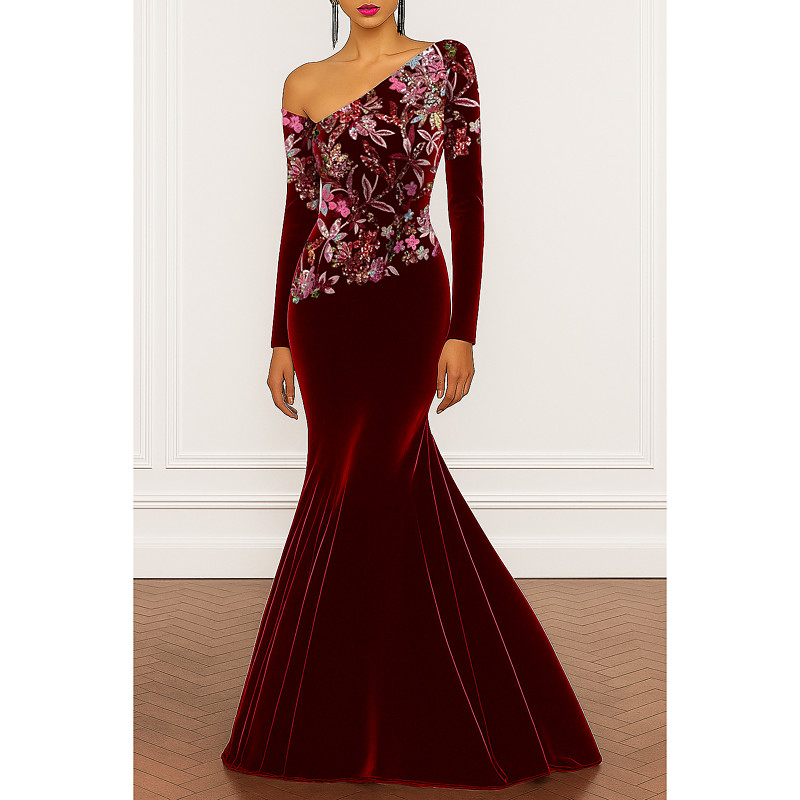 Mermaid Trumpet Floor Length Beaded Eembroidered Formal Dresses Mother of the Bride Dress Prom Dresses Evening Gown Ball Gown Formal Dress Elegant Vintage Long Sleeve One Shoulder Wedding Formal