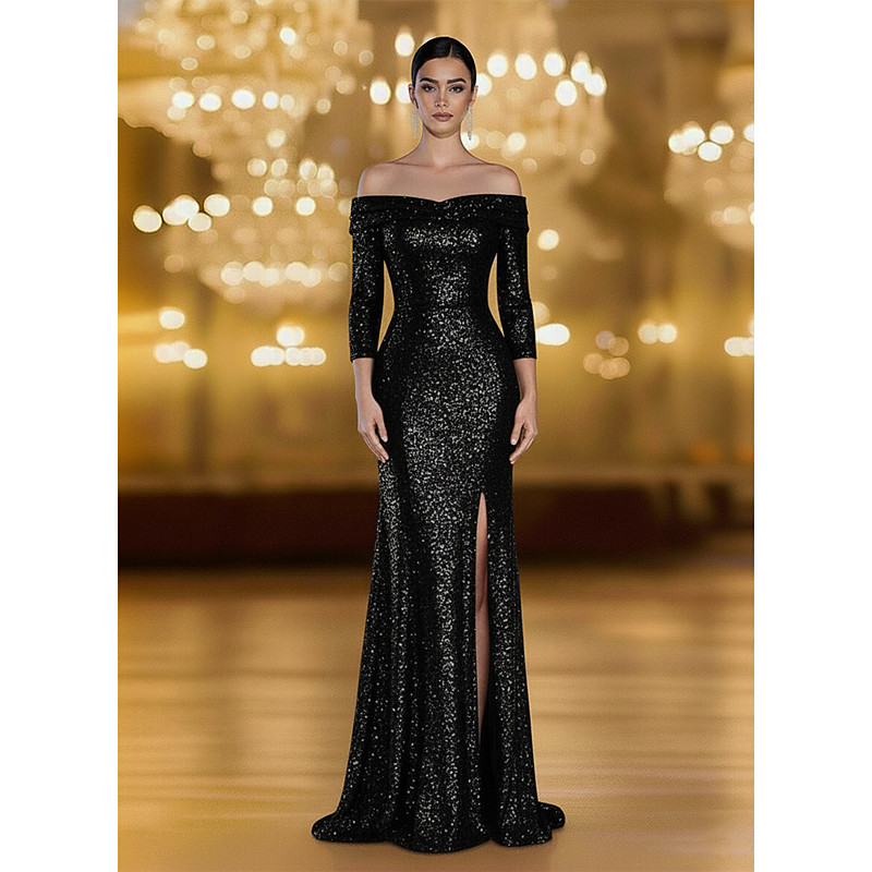 Mermaid Trumpet Floor Length Prom Dresses Evening Gown Ball Gown Formal Dress Elegant Vintage 3/4 Length Sleeve Off Shoulder Wedding Formal Sequined with Ruched Sequin Slit