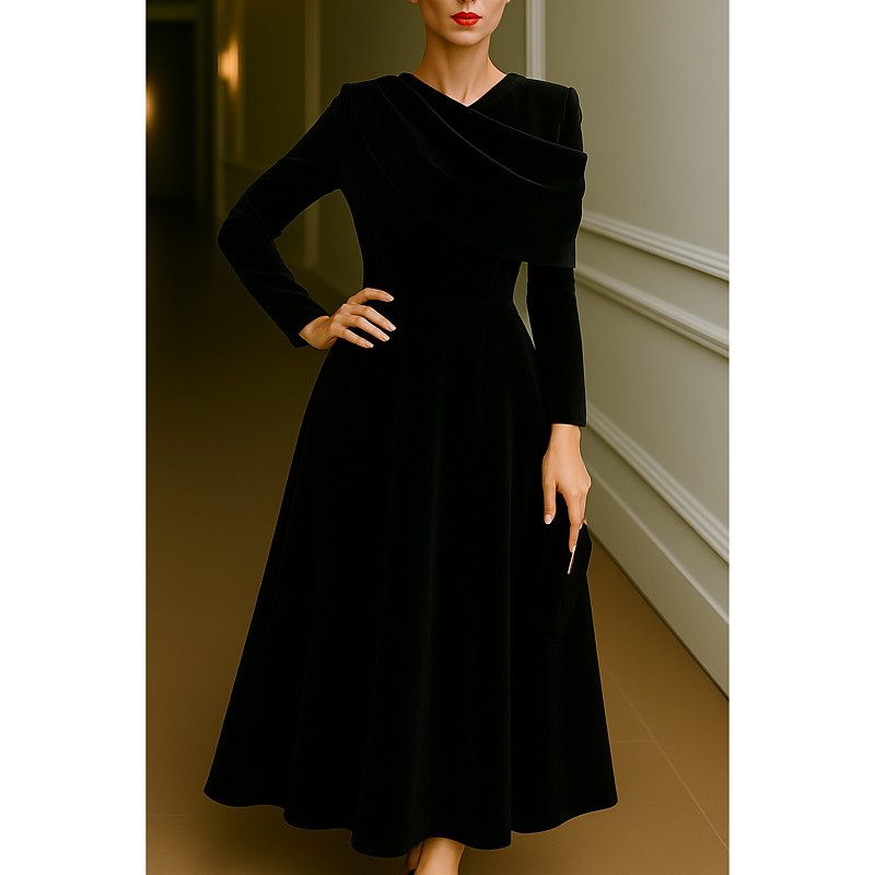 A-Line Floor Length Evening Gown Ball Gown Formal Dress Elegant Long Sleeve Stand Collar Wedding Formal Velvet with Pleats
