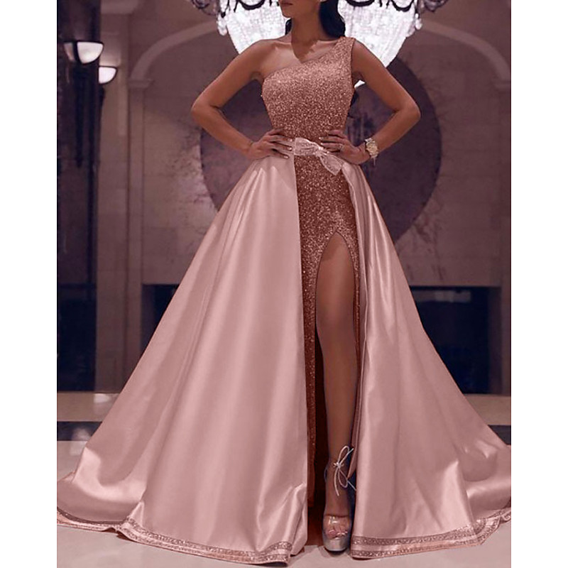 Ball Gown Floor Length Prom Dresses Evening Gown Ball Gown with Overskirt Formal Dress Sparkle Shine Sexy High Split Sleeveless One Shoulder Evening Party Wedding Guest Detachable Satin with Bow(s