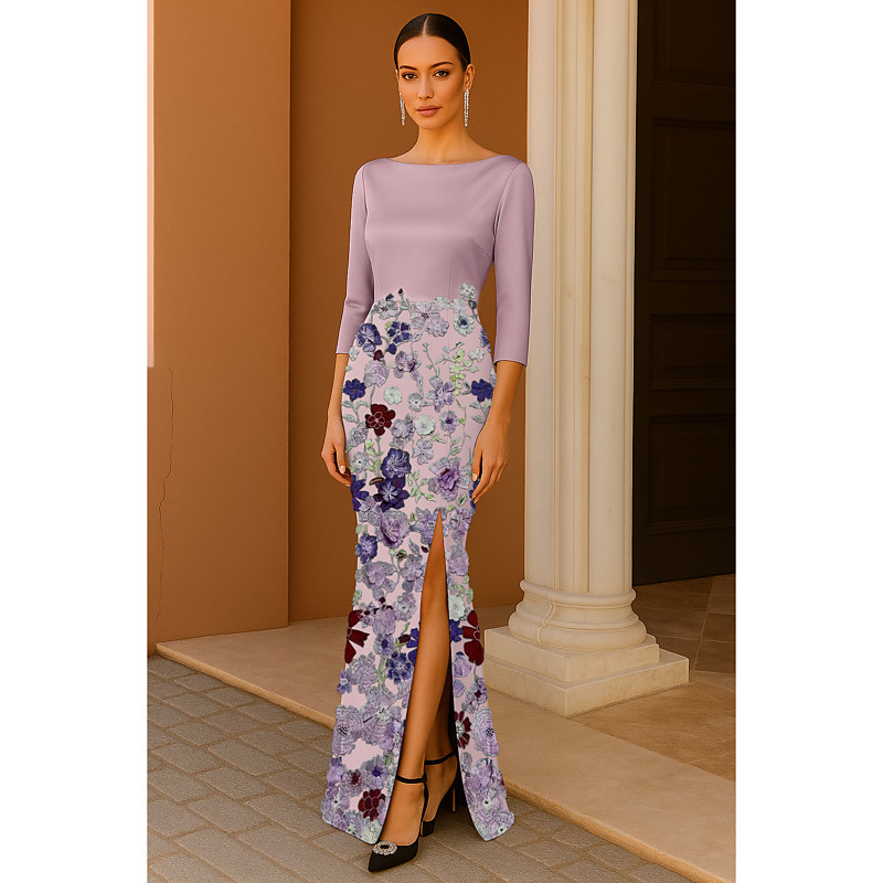Mermaid Trumpet Floor Length Prom Dresses Evening Gown Ball Gown Formal Dress Elegant 3/4 Length Sleeve Crew Neck Garden Party Wedding Satin with Slit Embroidery Appliques