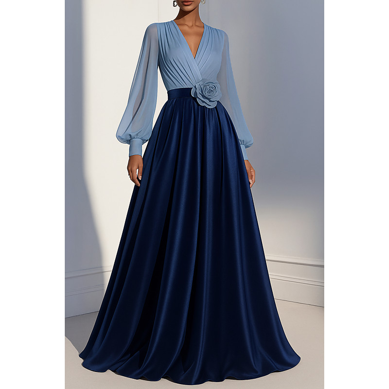 A-Line Floor Length Evening Gown Ball Gown Formal Dress Elegant Color Block Silky Long Sleeve V Neck Wedding Formal Pocket Chiffon Satin with Embroidered Flower