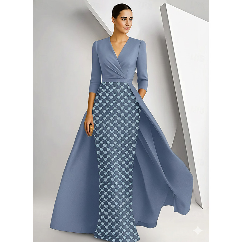 A-Line Floor Length Beaded Eembroidered Formal Dresses Mother of the Bride Dress Evening Gown Ball Gown with Overskirt Formal Dress Elegant Glittering Sparkle 3/4 Length Sleeve V Neck Wedding Formal