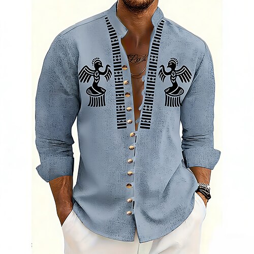 Herren Geometrisch Vogel Stammes Hemd Stehkragenhemd Langarm Vintage-Retro Lässig Urlaub Frühling Herbst Mandarinkragen Stehkragen Button-Down Leinenähnliches Hemd Blau Gelb Grün Khaki Grau