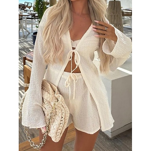 Per donna Set da due pezzi Set di Pantaloncini Manica Lunga Scollo a V Semplice Vacanza Moda Streetwear Casuale Quotidiano All'aperto Bianco Beige Estate Vestibilità regolare