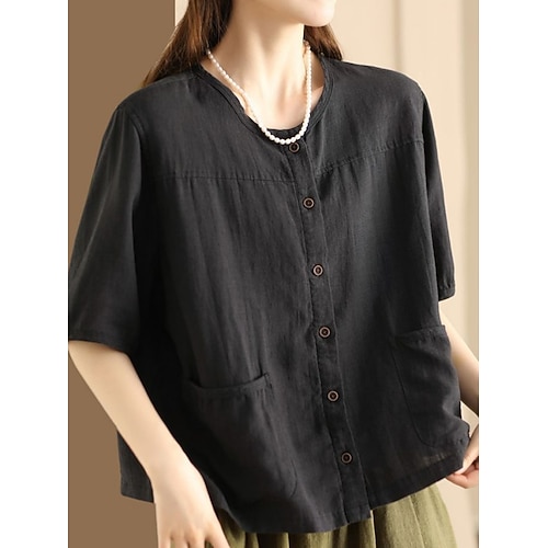 Per donna Blusa Semplice Elegante Casual Mezza Manica Girocollo Top Regolari Quotidiano Tasca Bottoni Nero Bianco Rosa Verde Cachi Estate Primavera