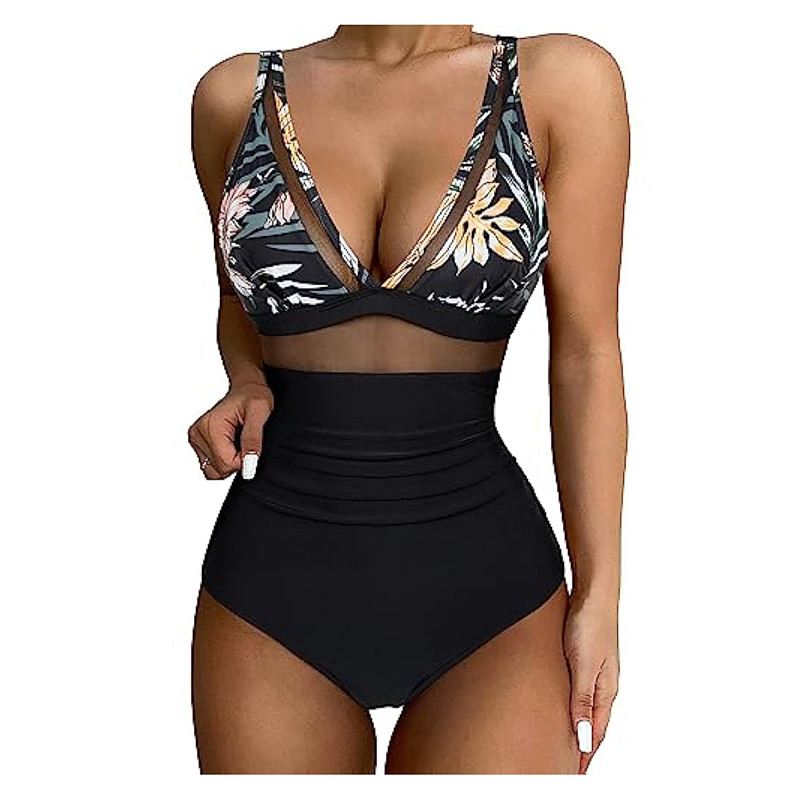 Women's Swimwear One Piece Monokini Swimsuit Mesh Tummy Control High Waist Slim Backless Vacation Beach Wear Leopard Leaves V Neck Sleeveless Bathing Suits