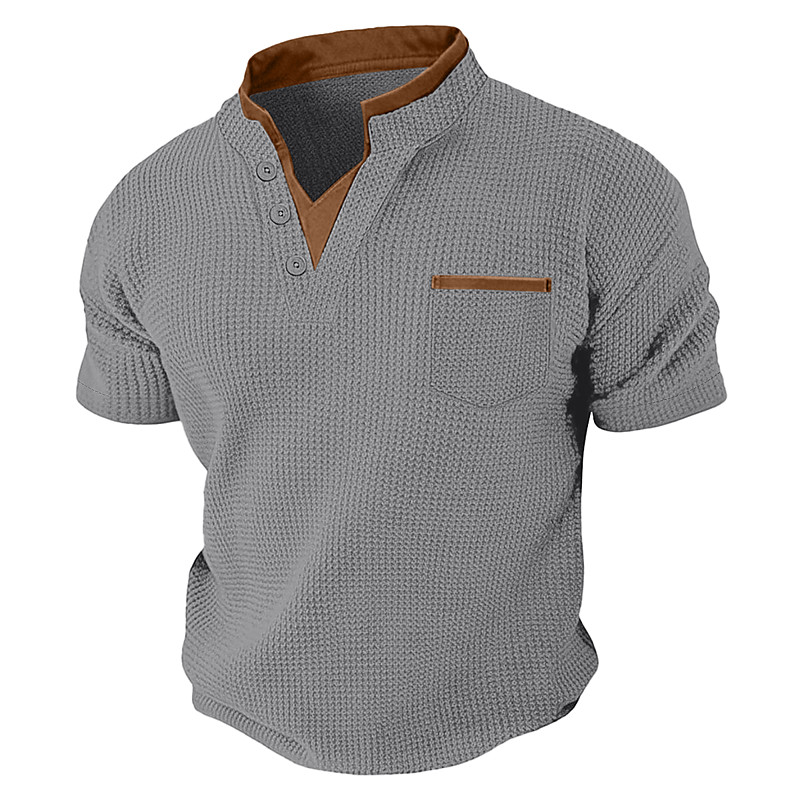 Men's Waffle Knit Tee Tee Top Short Sleeve V Neck Mandarin Collar Summer Spring All Seasons Solid Color Color Block Fashion Designer Casual Buttons Fake two piece Casual Daily Outdoor Light Blue Army