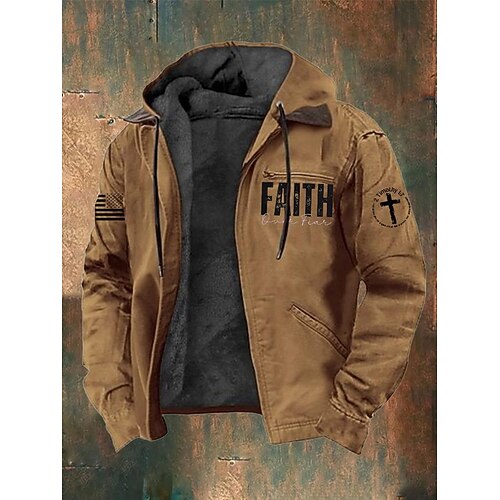 Per uomo Felpa con cappuccio a zip intera Giacca in Pile Felpa con cappuccio in pile Nero Marrone Con Cappuccio Croce Bandiera Americana Fede Tasca Stampato Casuale Quotidiano Uscire Poliestere
