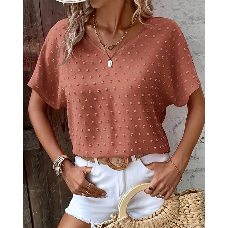 Women's Shirt Plain Stylish Modern Short Sleeve V Neck Regular Tops Daily Holiday Guipure Pink Blue Rose Pink Summer