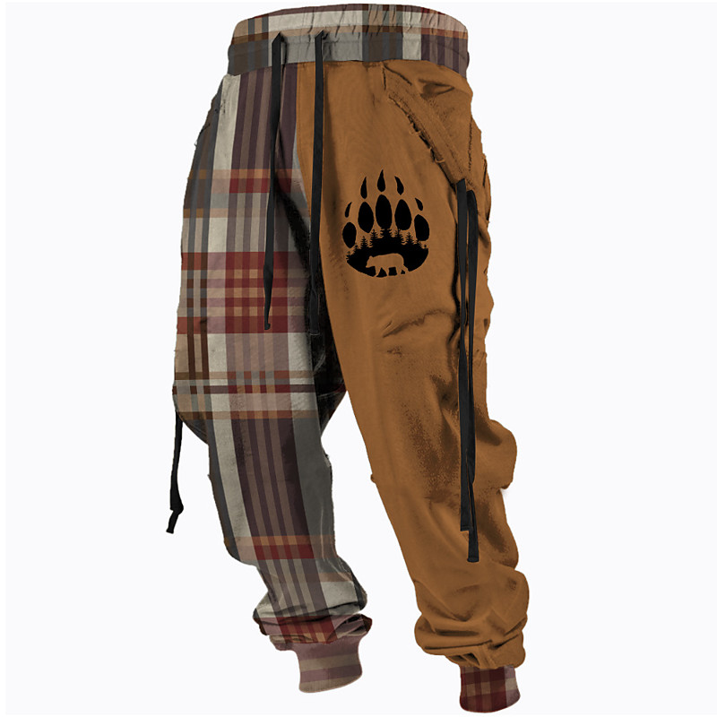 Men's Plaid Bear Paw Sweatpants Trousers Mid Waist Drawstring Elastic Waist Active Vintage Casual Outdoor Streetwear with Pockets Spring Fall 3D Print Black Yellow Brown