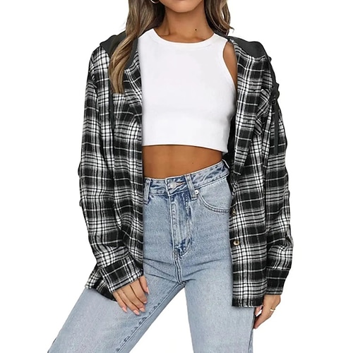 Women's Fall Outfits Shirts Jacket Coats Hooded Long Sleeve Top Athleisure Plaid Checkered Fashion Outdoor Travel Sports Sportswear Activewear Apricot Black Red