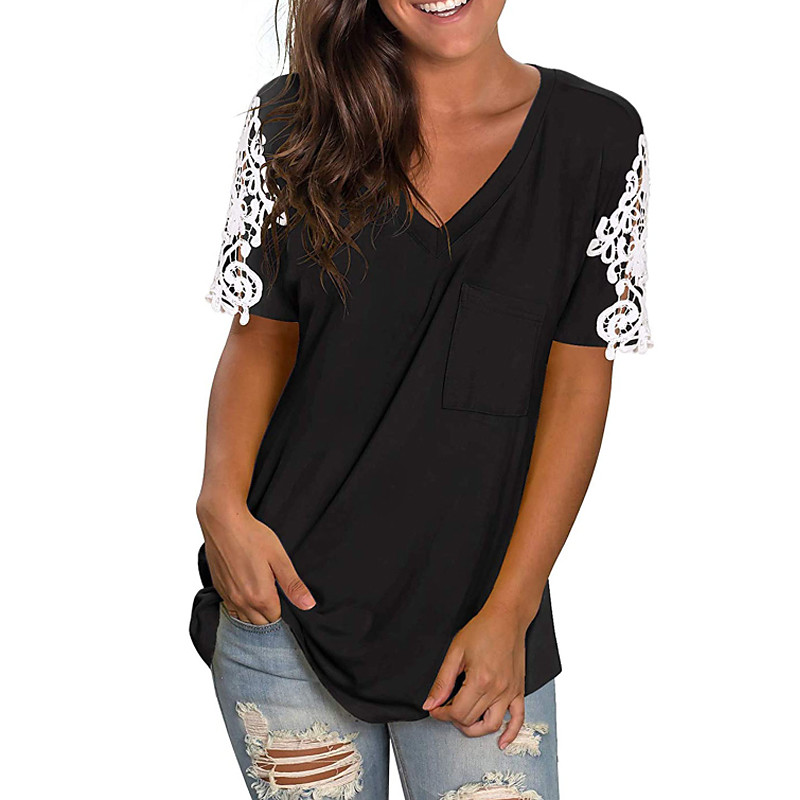 Damen Weiße Elegante Spitze Tops Eyelet Bluse Mode Unifarben Reguläre Tops Kurzarm V-Ausschnitt Spitze Reguläre Passform Urlaub Alltag Romantische Petite Tops Sommer Urlaubsbekleidung Schwarz Weiß