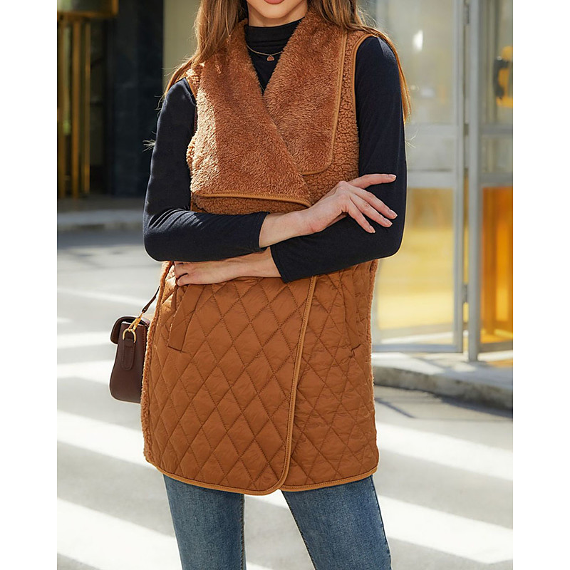Women's Winter Coat Fleece Vest Vest Warm Comfortable Patchwork Pocket Elegant Fashion Casual Solid Color Vacation Street Casual Daily Wear Long Turndown Regular Fit Sleeveless Outerwear Black Camel