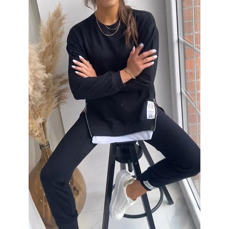Women's Streetwear Daily T Shirt Chinos Long Sleeve Crew Neck Solid Color Patchwork Outdoor Office Black Beige Gray Spring Fall Regular Fit