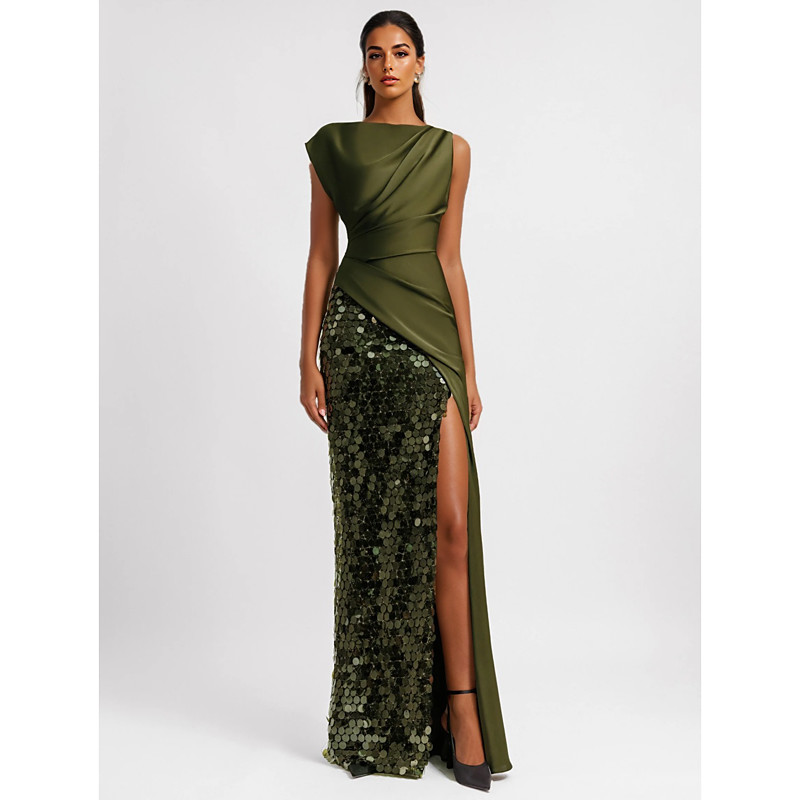 A-Line Floor Length Prom Dresses Evening Gown Ball Gown Formal Dress Elegant Glittering High Split Sleeveless Crew Neck Formal Pocket Italy Satin with Glitter Ruched