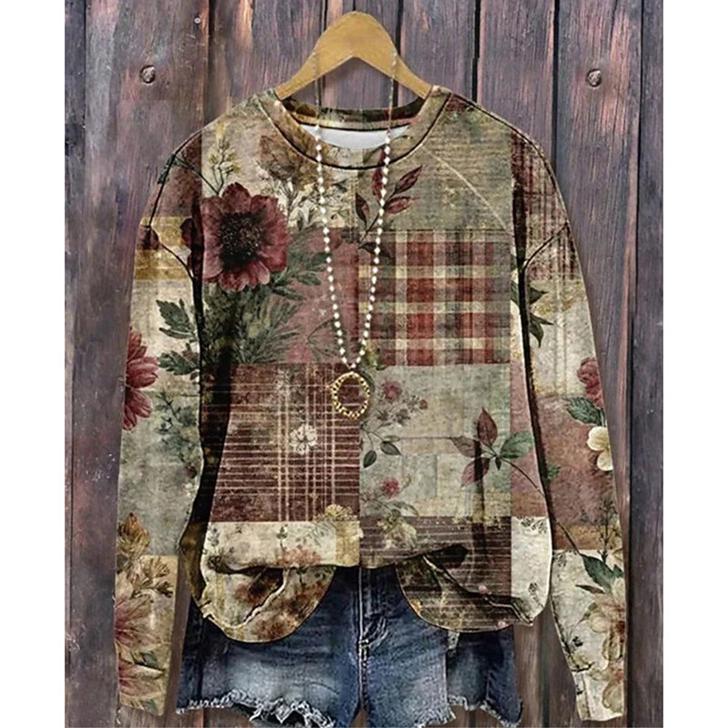 Women's Pullover Sweatshirt Floral Graphic Fashion Casual Long Sleeve Crew Neck Regular Tops Street Dailywear Casual Patchwork Print Blue Black Dark Green Brown Fall Winter