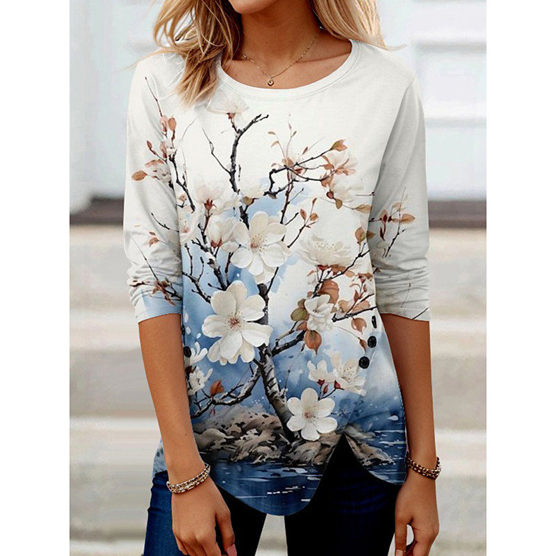 Women's T Shirt Floral Graphic Plants Vintage Stylish Ethnic Long Sleeve Crew Neck Regular Tops Daily Buttons Print Asymmetrical Pink Blue Green Spring Fall