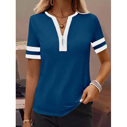 Per donna Maglietta Cerniera Grafico Geometrico Blocco di colori Vintage Hawaiano Elegante Manica Corta Girocollo Scollo a V Top Regolari Casuale Quotidiano Sportivo Blu Nero Bianco Estate Primavera
