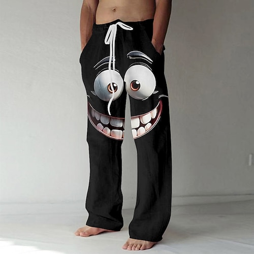 Herren 3D Zeichentrick Lächelndes Gesicht Große Augen Hose Baggy-Hosen Freizeithose Mittlere Taille Lustig Outdoor Urlaub Elastischer Kordelzug in der Taille Leinenähnliche Hose mit Taschen Sommer