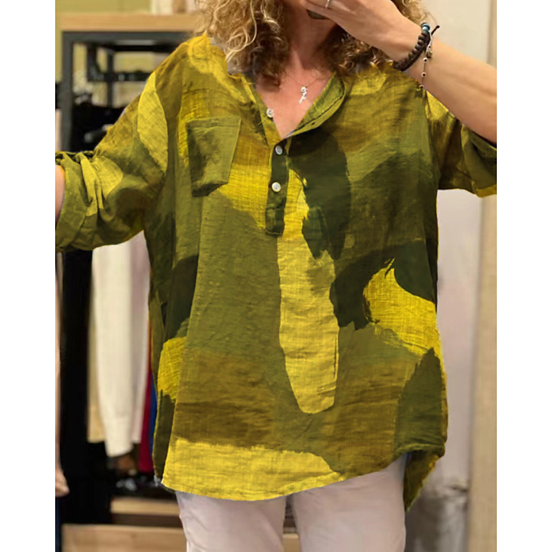 Women's Shirt Cotton Linen Shirts Blouse Color Block Modern Casual Long Sleeve Shirt Collar Regular Tops Daily Going out Print Yellow Red Fuchsia Green Light Grey Summer
