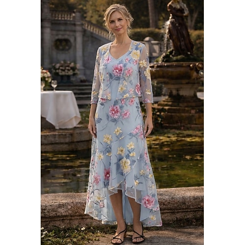 Linea ad A Abito Lunghezza al pavimento Abito da invitata a nozze Abito da cerimonia per signora Manica 3/4 Scollo a V Scollo Illusione Elegante Vintage Formale Ospite di nozze Semi-Formale Chiffon