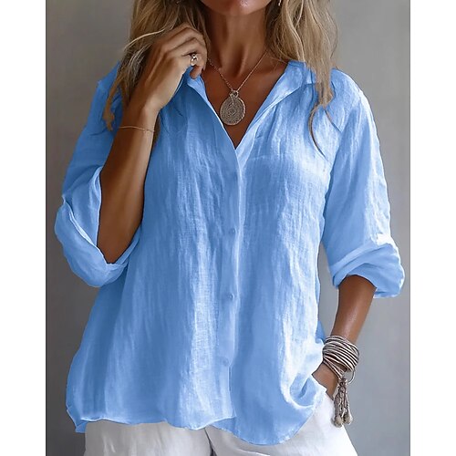 Per donna Camicia Blusa Semplice A righe Casual Manica Lunga Colletto a Camicia Top Regolari Ferie Uscire Bottoni Bianco Blu Azzurro cielo Arancione Beige Estate