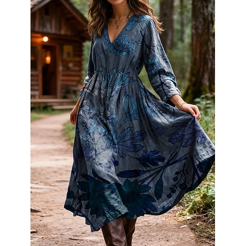 Per donna Abito Midi Abito a Tubino Casual Ferie Uscire Vestibilità regolare Floreale Grafico Manica Lunga Scollo a V Blu Rosso scuro Verde Blu scuro Estate Primavera