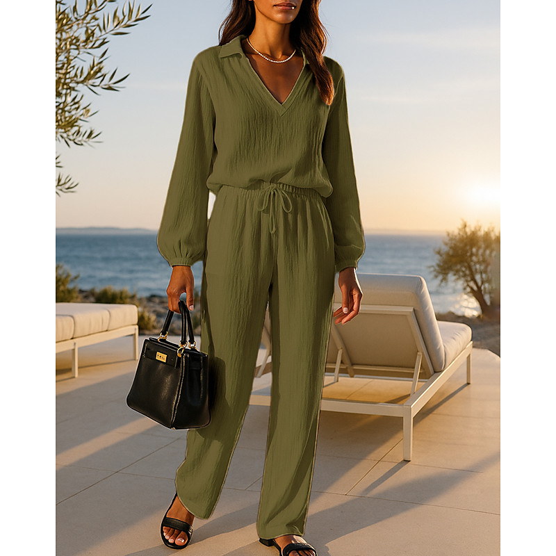 Women's Fashion Streetwear Cotton Linen Sets Two Piece Sets Pants Sets Long Sleeve V Neck Plain Daily Wear Date Black Army Green Navy Blue Summer Regular Fit
