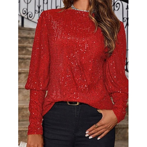 Natale Per donna Blusa Tinta unica Elegante Casual Manica Lunga Girocollo Top Regolari Quotidiano Paillettes Rosso Blu Fucsia Verde Primavera Autunno Inverno