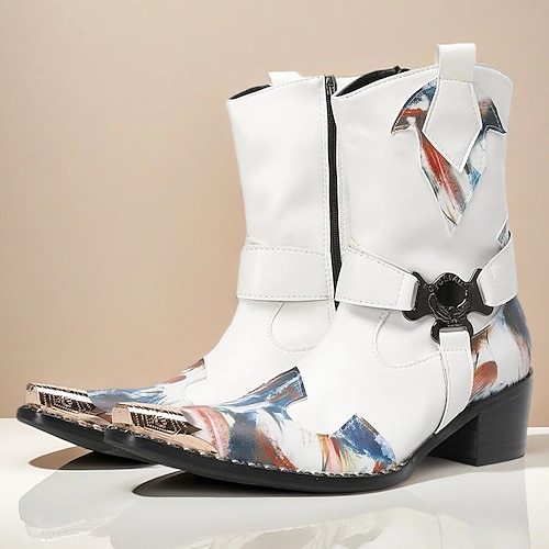 stivali da cowboy da uomo in vera pelle bianca con stampa artistica e dettaglio fibbia: calzature uniche per occasioni casual e festive