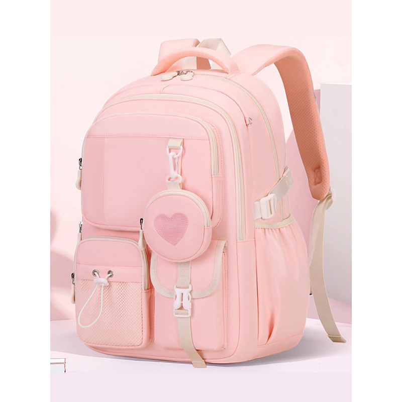Children's Waterproof Scratch-Resistant Pink School Backpack – Large Capacity Multi-Pocket Travel and Kindergarten Bag with Heart Design for Girls