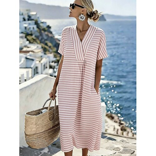 Per donna Abito Midi Vestito Casual Vestito Estivo Vacanza Casual Spiaggia Spiaggia Feste Vestibilità comoda Grafico A righe Manica Corta Scollo a V Blu Giallo Rosa Viola Estate Primavera